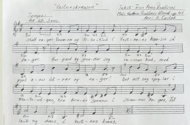 Songen er ein hyllest til den storslagne naturen vi har i Vestnes. Men den er og eit uttrykk for glede over å bu her og over dei som eg bur saman med. Det er og ein hyllest til det fine som har skjedd og vil skje i Vestnes.